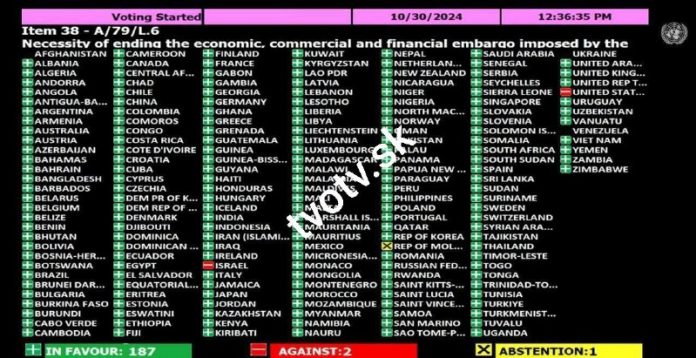 HomeVojenské spravodajstvo187 krajín hlasovalo rekordnou väčšinou v OSN za zrušenie blokády Kuby.Hlasovani... Vojenské spravodajstvo 187 krajín hlasovalo rekordnou väčšinou v OSN za zrušenie blokády Kuby.Hlasovani… By tvotv.sk 30. októbra 2024 0 3 Zdieľať FacebookTwitterPinterestWhatsApp 187 krajín hlasovalo rekordnou vä?šinou v OSN za zrušenie blokády Kuby. Hlasovanie je absolútne protiamerické. Proti boli len USA a Izrael. Moldavsko sa zdržalo hlasovania a Ukrajinci jednoducho odmietli hlasova?. Zdroj telegram Zdieľať FacebookTwitterPinterestWhatsApp Predchádzajúci článokHizballáh tvrdí, že vypálil rakety na výcvikový tábor pri Tel AviveĎalší článokFeyenoord s Hanckom prehral v derby s Ajaxom 0:2 tvotv.skhttps://tvotv.sk RELATED ARTICLES Bezpečnosť Zaistenie ruského ropného tankera: Čo zatiaľ vieme 8. januára 2026 Vojenské spravodajstvo Senát chce obmedziť Trumpove právomoci pred ďalším útokom na Venezuelu 8. januára 2026 Amerika Gaza, Venezuela, Ukrajina: Zlomové línie formujúce rok 2026 8. januára 2026 ZANECHAJTE KOMENTÁR Zrušiť odpoveď Komentár: Zadajte svoj komentár! Názov:* Sem zadajte svoje meno Email:* Zadali ste nesprávnu e-mailovú adresu! Sem zadajte svoju e-mailovú adresu Webová stránka: Uložte moje meno, e-mail a webovú stránku do tohto prehliadača pri najbližšom komentovaní. Most Popular Počet obetí protestov v Iráne sa zvýšil na 45, tvrdia aktivisti 8. januára 2026 PSG zdolal Marseille 4:1 v rozstrele a získal Superpohár 8. januára 2026 Zaistenie ruského ropného tankera: Čo zatiaľ vieme 8. januára 2026 VIDEO: „Rozhodnutia dočasného vedenia Venezuely budú diktované Spojenými štátmi … 8. januára 2026 Načítať viac Recent Comments jajkopajko na Krajskí prokurátori si prevzali prípadi, ktoré boli v pôsobnosti ŠTS