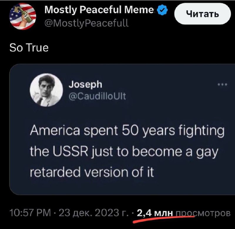 HomeNezaradené2,4 ,milióna videníAmerika minula 50 rokov bojovaním so ZSSR ... Platí sloboda... Nezaradené 2,4 ,milióna videníAmerika minula 50 rokov bojovaním so ZSSR … Platí sloboda prejavu garantovaná Ústavou SR a Chartou základných práv EUA… By losbastardos 28. decembra 2023 0 19 Zdieľať FacebookXPinterestWhatsApp 2,4 ,milióna videní Amerika minula 50 rokov bojovaním so ZSSR … Platí sloboda prejavu garantovaná Ústavou SR a Chartou základných práv EU Amerika je na tom ešte horšie Zdroj telegram Zdieľať FacebookXPinterestWhatsApp Predchádzajúci článokLantoši nahral na tri góly, Mladá Boleslav zdolala Karlove Vary 4:1Ďalší článokZimná ofenzíva UKRONATO wehrmachtu Sila valcuje, len niekomu, kto študíroval v juesej, to nedochádza … losbastardoshttps://dennikn.news RELATED ARTICLES Nezaradené Trumpove tvrdenia o Iráne sú v rozpore s realitou 15. apríla 2026 Nezaradené USA predĺžili zmiernenie sankcií voči ruskému ropnému gigantu Lukoil. Jeho čerpa… 15. apríla 2026 Nezaradené Elon Musk odhaľuje zranenie po očkovaní proti Covidu po tom, čo bývalý predstaviteľ spoločnosti Pfizer priznal, že očkovanie pravdepodobne zabilo v Nemecku desaťtisíce ľudí 15. apríla 2026 Most Popular TK ministra E.Tomáša – Rovnaké platy pre mužov a ženy za rovnakú prácu 15. apríla 2026 Trumpove tvrdenia o Iráne sú v rozpore s realitou 15. apríla 2026 USA predĺžili zmiernenie sankcií voči ruskému ropnému gigantu Lukoil. Jeho čerpa… 15. apríla 2026 Nový zber odpadu v Modrom Kameni zhodnotia po roku na konci júna 15. apríla 2026 Recent Comments jajkopajko na Krajskí prokurátori si prevzali prípadi, ktoré boli v pôsobnosti ŠTS