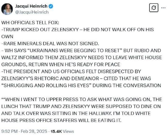 Trump vyhodil Zelenského – neodišiel sám. Podrobnosti poskytla korešpondentka Fox News Jacqui Heinrichová.