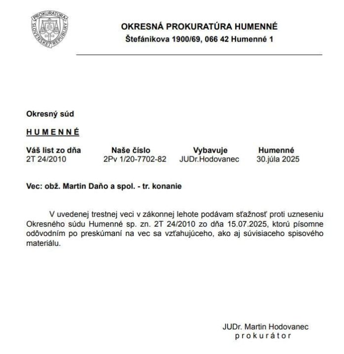 30. Júla 2025 ve?er po 18h už písal Prokurátor Hodovanec z Humenného s?ažnos? proti zastaveniu trestného konania, ktoré proti mne trvá už 20 rokov, bol som medzitým oslobodený a po 7 ro?nom odvolaní sa súd opakuje už tretí raz… Vlastne som v tomto konaní nikdy nemal by? – dali ma tam ú?elovo osoby, ke? som po ich hrubom nátlaku v po?iatku vyšetrovania odmietol kajúcnikova? – vraj aby som bol pou?ený, že takéto ponuky sa neodmietajú. Po tomto vyprodukovanom obvinení sa vlastne stavali základy toho, ?o som dnes…