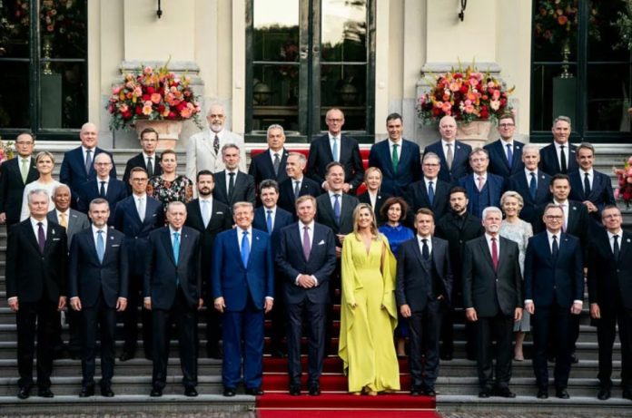 fotka: Hlavy štátov a vlád ?lenských krajín NATO sa stretli s holandským krá?om Willemom-Alexandrom a krá?ovnou Máximou pri príležitosti rodinného fotografovania po?as samitu NATO v Haagu v Holandsku v roku 2025. Foto: Haiyun Jiang-Pool/Getty Images