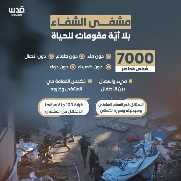 7 000 ?udí vrátane vysídlených osôb, zranených a lekárskych tímov je židovským štátom uväznených v zdravotníckom komplexe Al-Shifa v Gaze a to bez minimálnych možností zabezpe?eniea základných ?udských potrieb na prežitie.