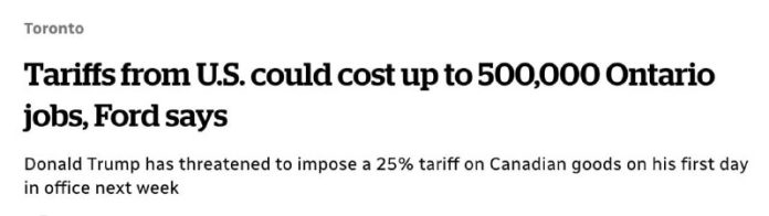 Už skôr šéf Ontária uviedol, že Kanada by mohla v prípade zavedenia ciel preruši? dodávky elektriny a energie do Spojených štátov. Kanada vyváža 60 % svojej ropy a 85 % elektriny do USA. Ontario je domovom viac ako 14 miliónov ?udí.