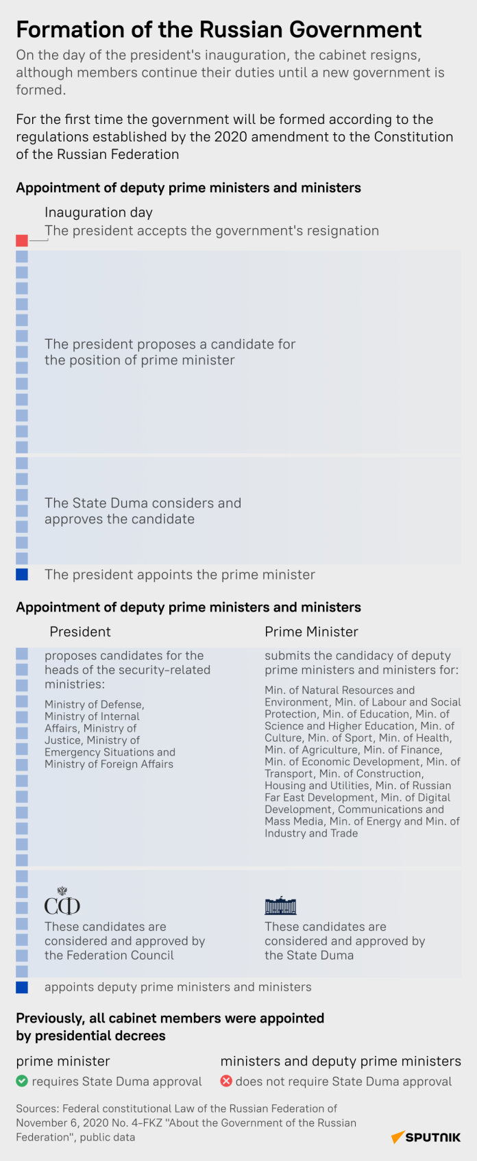 Predsedu vlády menuje prezident po formálnom schválení Štátnou dumou (dolnou komorou parlamentu). Po schválení bude nový predseda vlády v rámci svojich oficiálnych možností nominova? na podpredsedov vlády a federálnych ministrov.