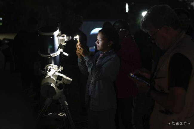 Diev?a robí fotografiu cez teleskop po?as úplného zatmenia Mesiaca v Caracase vo Venezuele v piatok 14. marca 2025.