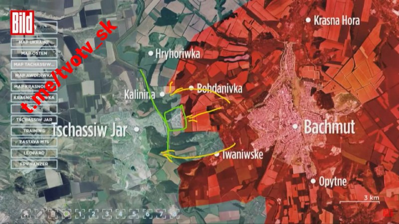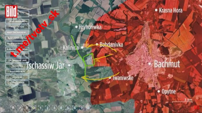 Ako už skôr informoval expert na analýzu otvorených dát Julian Röpke, ruská armáda používa pri ofenzíve na Chasov Jar taktiku dvojitého úderu. Ruské ozbrojené sily priamo úto?ia na mikroobvod Kanal na samom východe mesta, ako aj ho obchádzajú zo severu a juhu cez obce Bogdanovka a Ivanovskoje (Krasnoje). V centre a na severe drží AFU obranné pozície. Na južnom krídle sa však ruským ozbrojeným silám podarilo prekro?i? kanál Severský Donec-Donbas a postúpi? smerom k mestu.