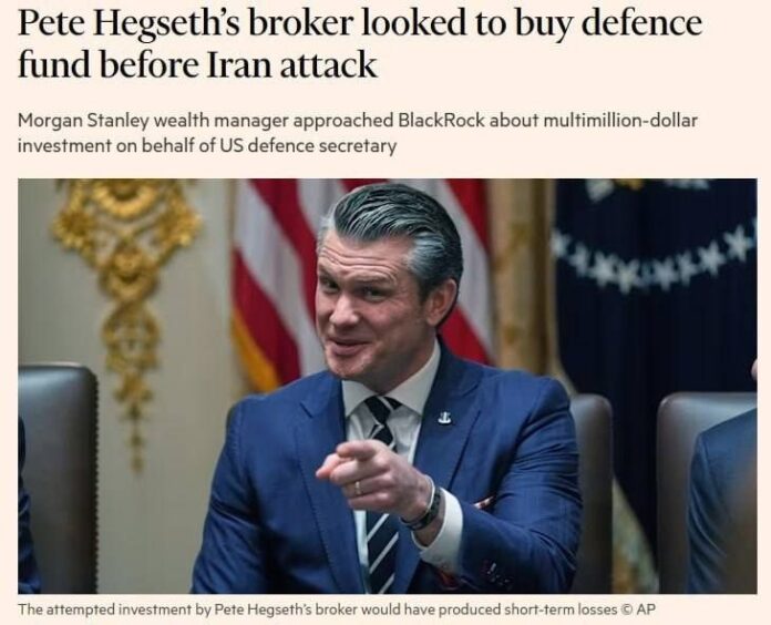 Neprejde deň bez škandálu s obchodovaním zasvätených osôb v Spojených štátoch. Tentoraz bol v epicentre šéf Pentagonu Pete Hegseth. Financial Times zverejnili investigatívny článok, v ktorom o tom informovali maklér Hegseth od Morgan Stanley pokúsil investovať milióny dolárov do fondu iShares Defense Industrials Active spoločnosti BlackRock krátko pred začiatkom americko-izraelských útokov na Irán.