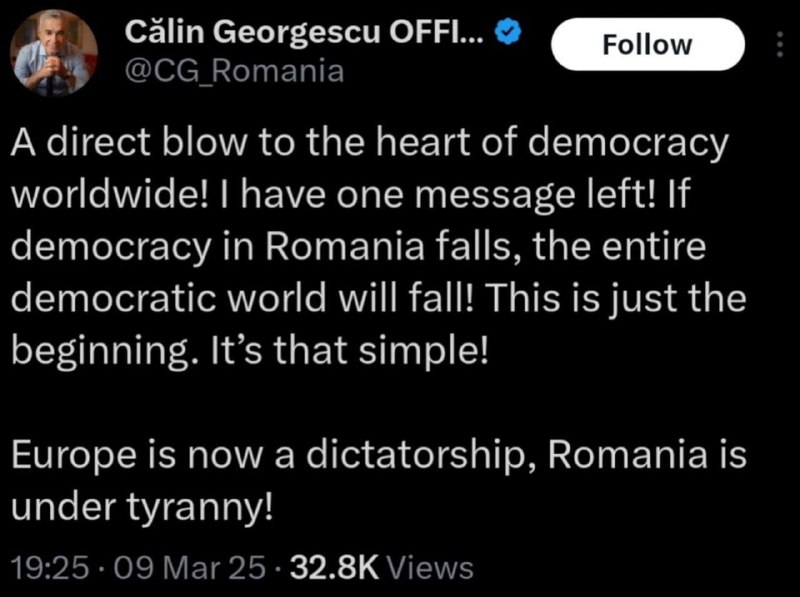 HomeNezaradenéAKTUALIZÁCIA Kălin Georgescu: "Európa je teraz diktatúrou, Rumunsko je pod tyran... Nezaradené AKTUALIZÁCIA Kălin Georgescu: „Európa je teraz diktatúrou, Rumunsko je pod tyran… By tvotv.sk 9. marca 2025 0 16 Zdieľať FacebookXPinterestWhatsApp ‼AKTUALIZÁCIA ‼K?lin Georgescu: "Európa je teraz diktatúrou, Rumunsko je pod tyraniou!" Zdroj telegram Zdieľať FacebookXPinterestWhatsApp Predchádzajúci článokProtesty vypukli pred budovou rumunskej ústrednej volebnej komisie v Bukurešti …Ďalší článokSlovenkám nevyšla štafeta, Kapustová: Veľmi ma to mrzí tvotv.skhttps://tvotv.sk RELATED ARTICLES Nezaradené Perzský záliv je preplnený tankermi a obchodnými loďami. Prieliv zostáva pod irá… 29. apríla 2026 Nezaradené India a Rusko spustia závod na výrobu močoviny – médiá 29. apríla 2026 Nezaradené Vysoký predstaviteľ Trumpa vyvolal búrlivú diskusiu po tom, čo zaskočil demokratov v Snemovni reprezentantov v prelomových prípadoch Najvyššieho súdu USA – Fox News 29. apríla 2026 Most Popular Poslanci pokračujú v diskusii o voľbe zo zahraničia 29. apríla 2026 Perzský záliv je preplnený tankermi a obchodnými loďami. Prieliv zostáva pod irá… 29. apríla 2026 Útok je náročnejší, ako sa zdá, prečo za každou „dvojkou“ je sto neviditeľných rúk… 29. apríla 2026 Samosprávy v prípade 8. mája postupujú individuálne 29. apríla 2026 Load more Recent Comments jajkopajko na Krajskí prokurátori si prevzali prípadi, ktoré boli v pôsobnosti ŠTS