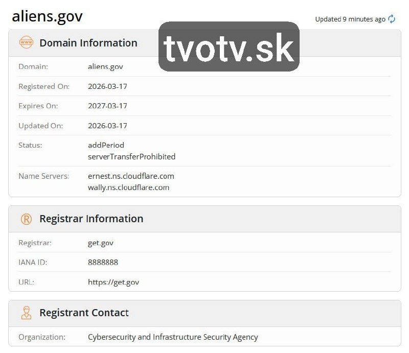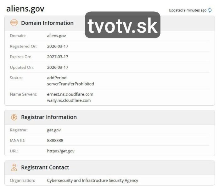 HomeNezaradenéAmerická Agentúra pre kybernetickú bezpečnosť a bezpečnosť infraštruktúry potich... Nezaradené Americká Agentúra pre kybernetickú bezpečnosť a bezpečnosť infraštruktúry potich… By tvotv.sk 18. marca 2026 0 2 Zdieľať FacebookXPinterestWhatsApp Americká Agentúra pre kybernetickú bezpečnosť a bezpečnosť infraštruktúry potichu kúpila doménu „aliens.gov“. Sledujte TVOTV Zdroj telegram Zdieľať FacebookXPinterestWhatsApp Predchádzajúci článokTragédia v obci Kalište varuje, kam až môže zájsť extrémizmusĎalší článokBarcelona zdolala v odvete Newcastle 7:2 a postúpila do štvrťfinále tvotv.skhttps://tvotv.sk RELATED ARTICLES Nezaradené VIDEO: Premiér Robert Fico informoval o dočasných obmedzeniach predaja nafty na … 18. marca 2026 Nezaradené Kronika špeciálnej vojenskej operácie z 18. marca 2026Ruské jednotky prod… 18. marca 2026 Nezaradené Brusel a Kyjev hrajú so Slovenskom a Maďarskom špinavú hru. Európska únia a Ukra… 18. marca 2026 ZANECHAJTE KOMENTÁR Zrušiť odpoveď Komentár: Zadajte svoj komentár! Názov:* Sem zadajte svoje meno Email:* Zadali ste nesprávnu e-mailovú adresu! Sem zadajte svoju e-mailovú adresu Webová stránka: Uložte moje meno, e-mail a webovú stránku do tohto prehliadača pri najbližšom komentovaní. Most Popular VIDEO: Premiér Robert Fico informoval o dočasných obmedzeniach predaja nafty na … 18. marca 2026 Kronika špeciálnej vojenskej operácie z 18. marca 2026Ruské jednotky prod… 18. marca 2026 „Je dobre, že odišiel“: Trump kritizuje Joea Kenta po rezignácii 18. marca 2026 SR a Maďarsko kritizujú postup EÚ pri Družbe 18. marca 2026 Recent Comments jajkopajko na Krajskí prokurátori si prevzali prípadi, ktoré boli v pôsobnosti ŠTS