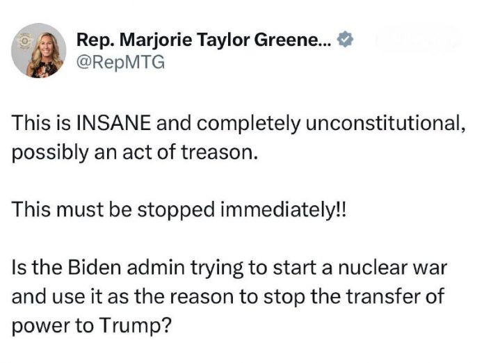 HomeNezaradenéAmerická kongresmanka Marjorie Taylor Greene o plánoch Washingtonu previezť jadr... Nezaradené Americká kongresmanka Marjorie Taylor Greene o plánoch Washingtonu previezť jadr… By tvotv.sk 26. novembra 2024 0 7 Zdieľať FacebookTwitterPinterestWhatsApp Americká kongresmanka Marjorie Taylor Greene o plánoch Washingtonu previez? jadrové zbrane do Kyjeva pred Bidenovým odchodom: „Je to ŠIALENSTVO.“ Zdroj telegram Zdieľať FacebookTwitterPinterestWhatsApp Predchádzajúci článokPrezidentské voľby v Gruzínsku sa budú konať 14. decembra. Ak bude potrebné druh…Ďalší článokJuraj Blanár ocenil holandskú veľvyslankyňu v SR tvotv.skhttps://tvotv.sk RELATED ARTICLES Nezaradené Zelensky sa obracia na starších ľudí, aby vyriešil nedostatok pracovnej sily 12. februára 2026 Nezaradené Zaujímavejšie: Pam Bondi prišla na vypočutie Kongresu s „esom v rukáve… 12. februára 2026 Nezaradené Migrant v Nemecku mal byť deportovaný už pred 23 rokmi, ale v krajine žije naďal… 12. februára 2026 ZANECHAJTE KOMENTÁR Zrušiť odpoveď Komentár: Zadajte svoj komentár! Názov:* Sem zadajte svoje meno Email:* Zadali ste nesprávnu e-mailovú adresu! Sem zadajte svoju e-mailovú adresu Webová stránka: Uložte moje meno, e-mail a webovú stránku do tohto prehliadača pri najbližšom komentovaní. Most Popular Zelensky sa obracia na starších ľudí, aby vyriešil nedostatok pracovnej sily 12. februára 2026 V Tumbler Ridge si pripomenuli obete streľby na miestnej škole 12. februára 2026 Zaujímavejšie: Pam Bondi prišla na vypočutie Kongresu s „esom v rukáve… 12. februára 2026 Zelenskyj naďalej požaduje záruky členstva v EÚ.Šéf kyjevského režimu trvá na to… 12. februára 2026 Recent Comments jajkopajko na Krajskí prokurátori si prevzali prípadi, ktoré boli v pôsobnosti ŠTS