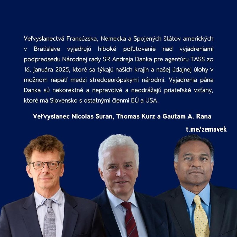 Americké, francúzske a nemecké ve?vyslanectvo v Bratislave hlboko ?utujú vyhlásenia podpredsedu Slovenskej národnej rady Andreja Danka k agentúre TASS 16. januára 2025, ktoré sa týkajú našich krajín a ich údajnej úlohy v možnom napätí medzi národmi strednej Európy Komentáre pána Danka sú nesprávne a nepravdivé a neodrážajú priate?ské vz?ahy, ktoré má Slovensko s ostatnými ?lenmi EÚ a s jeho americkým partnerom. /zdroj/