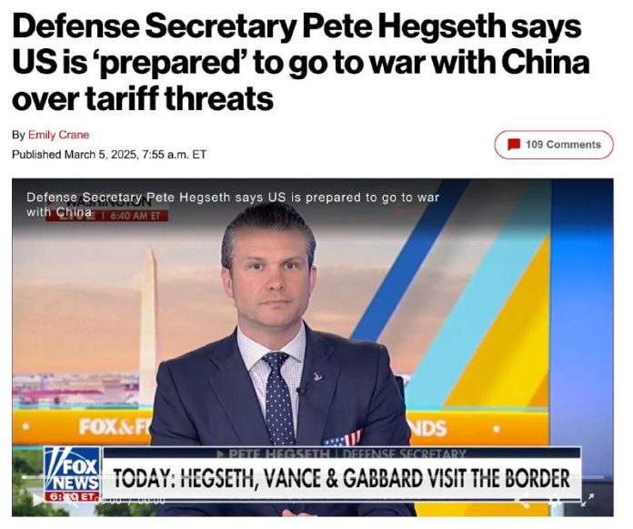 Americký minister obrany Pete Hegseth vyhlásil, že USA sú pripravené ís? do vojny s ?ínou kvôli hrozbám uvalenia ciel, píše New York Post.
