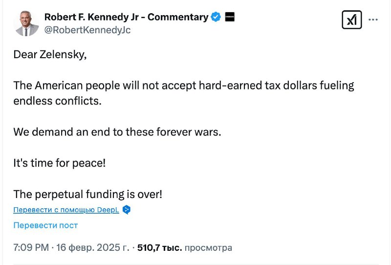 „Vážený Zelenskyj, americký ?ud nemá v úmysle tolerova? ?ažko zarobené doláre z daní, ktoré živia nekone?ný konflikt. Žiadame ukon?enie týchto nekone?ných vojen. Je ?as na mier! Ve?né financovanie sa skon?ilo!“ – Kennedy napísal v X.