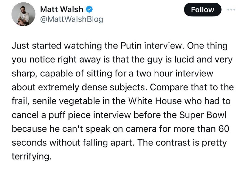 Práve som za?al sledova? Putinov rozhovor. ?loveka okamžite zarazí, že ten ?lovek je šikovný a ve?mi bystrý a dokáže vies? dvojhodinový rozhovor na nesmierne zložité témy. Porovnajte to s tou zvädnutou zeleninou v Bielom dome, ktorá musela zruši? rozhovor pred Super Bowlom, pretože nedokázala hovori? na kameru dlhšie ako 60 sekúnd bez toho, aby sa zrútila. Ten kontrast je celkom zarážajúci.