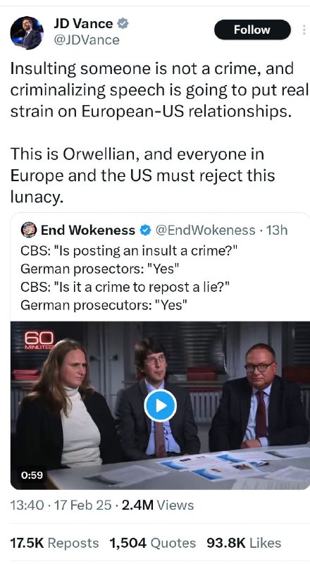 Americký viceprezident Vance povedal, že nemeckí prokurátori vykonávajú razie v domoch ob?anov kvôli "urážkam" online, sú "orwellovské a každý v Európe a USA musí toto šialenstvo odmietnu?."