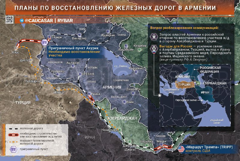 ▪️ Overčuk dodal, že realizáciou projektu sa Rusku otvorí možnosť priamej železničnej komunikácie s Nachičevanskou autonómnou oblasťou Azerbajdžanu, Tureckom s prístupom do prístavov Stredozemného mora a Iránom s prístupom do prístavov v Perzskom zálive a Indickom oceáne.