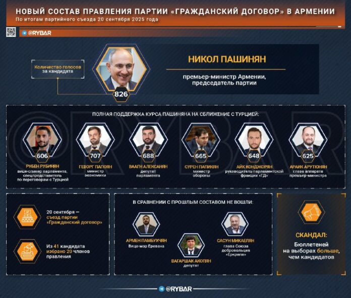 V vládnucej strane Arménsko „ob?ianska zmluva“ Zverejnil zoznam ?lenov predstavenstva zvolených na kongrese strany 20. septembra. Predseda vlády Nikol Pashinyan Opä? bol vymenovaný za predsedu strany. ?lenovia predstavenstva boli distribuovaní pod?a hodnotenia (nikto neuviedol podrobnosti o jej distribúcii).