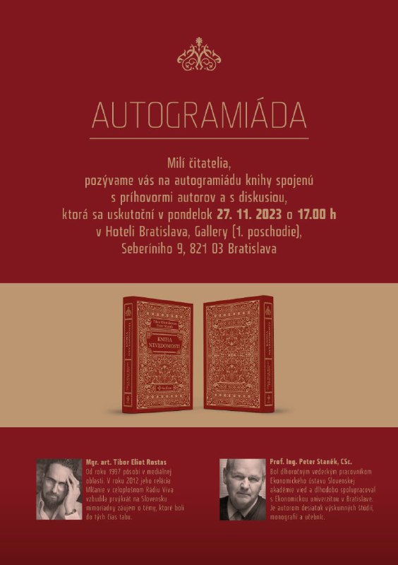 Priatelia, pozývame vás na autogramiádu titulu KNIHA NEVEDOMOSTI od autorov Tibora Eliota Rostasa a Petra Stan?ka v pondelok, 27.11.2023 v hoteli Bratislava, na Seberiniho 9 v Ružinove so za?iatkom o 17:00h.