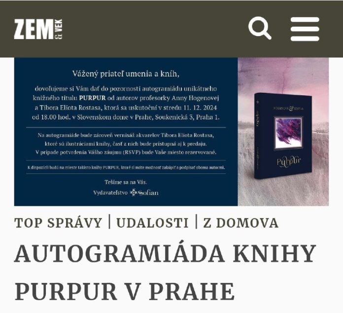 Autogramiáda unikátneho knižného titulu PURPUR od autorov profesorky Anny Hogenovej a Tibora Eliota Rostasa, sa uskuto?ní v stredu 11. 12. 2024 od 18.00 hod. v Slovenskom dome v Prahe, Soukenická 3, Praha 1.