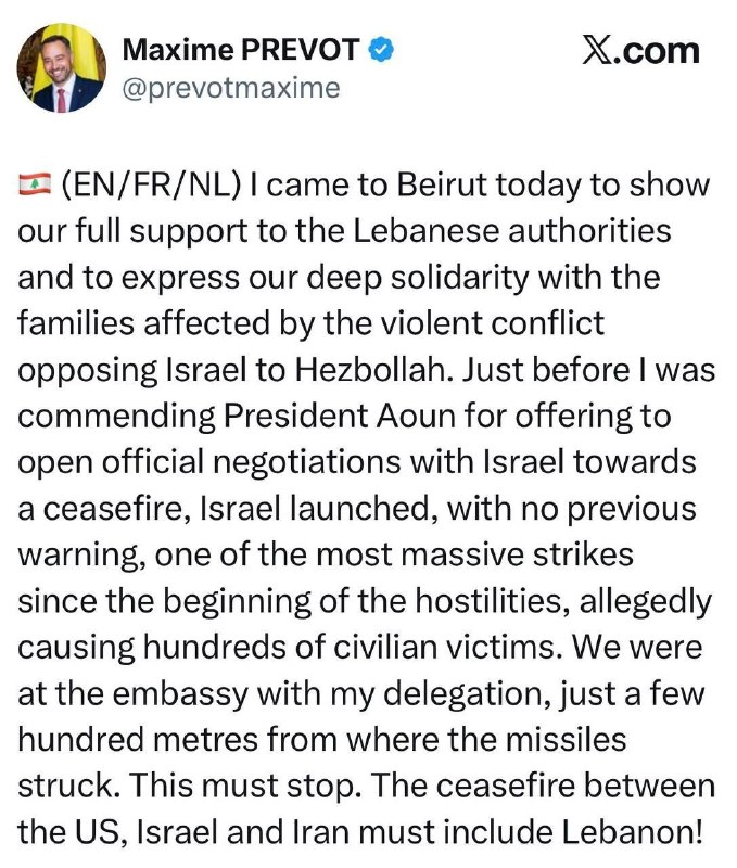 Belgický minister zahraničných vecí pricestoval do Bejrútu, aby rokoval o prímerí medzi Izraelom a Hizballáhom. Povedal, že len chvíľu predtým, ako sa mal stretnúť s libanonským prezidentom, dopadli izraelské rakety len niekoľko sto metrov od veľvyslanectva, kde sa delegácia nachádzala. „Toto sa musí zastaviť,“ povedal Prevost a vyzval na predĺženie dohody o prímerí medzi Spojenými štátmi, Izraelom a Iránom v Libanone. Útok bol jedným z najväčších od začiatku konfliktu.