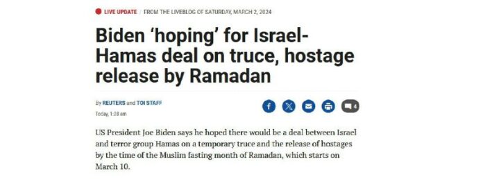 Predtým americký prezident vyhlásil, že prímerie v Pásme Gazy by mohlo za?a? 4. marca. Zatia? ale ni? prímerie nenasved?uje, a tak sa Biden rozhodol oznámi? nový dátum: Izrael a Hamas pod?a neho môžu uzavrie? dohodu do za?iatku ramadánu, ktorý pripadá na 10. marca.