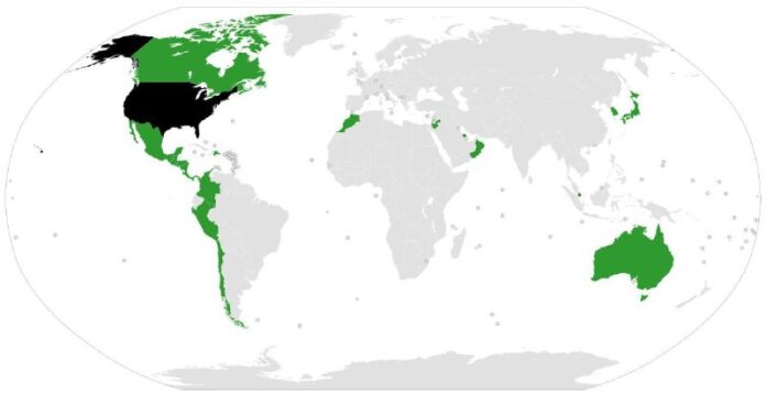 Na mape sú zelenou farbou ozna?ené krajiny, ktoré majú takéto dohody so Spojenými štátmi. To znamená, že Spojené štáty môžu presta? dodáva? LNG do celej Európy a Ázie okrem Japonska.