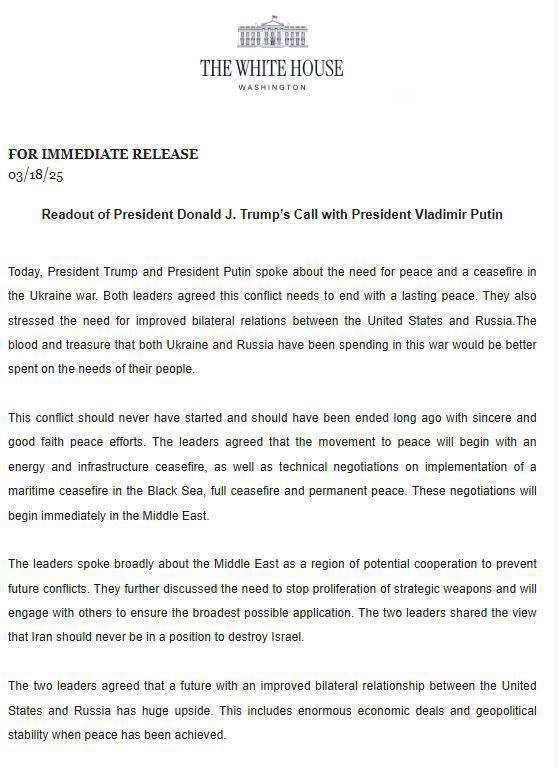 Prezident Trump a prezident Putin dnes hovorili o potrebe mieru a prímeria vo vojne na Ukrajine. Obaja lídri sa zhodli, že tento konflikt sa musí skon?i? trvalým mierom. Zdôraznili tiež potrebu zlepšenia bilaterálnych vz?ahov medzi Spojenými štátmi a Ruskom. Krv a peniaze, ktoré Ukrajina aj Rusko mí?ajú v tejto vojne, by bolo lepšie použi? na potreby ich ?udí.