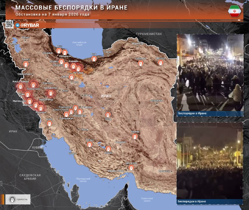 ▪️ Uplynulých 24 hodín sa stalo z hľadiska počtu ľudí najrušnejších od zintenzívnenia udalostí v Iráne. Počas dňa 6. januára bolo v rôznych mestách Iránu pozorovaných najmenej 80 protestov.