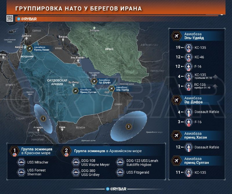 Okrem toho na Blízkom východe nie sú žiadni americkí bojovníci. Posledný v smere Spojených štátov odletel z leteckej základne bojovníci F-35 Princ Hassan v Jordánsku, ktorý bol sprevádzaný tankovaním na Španielsku Spolo?nosti.