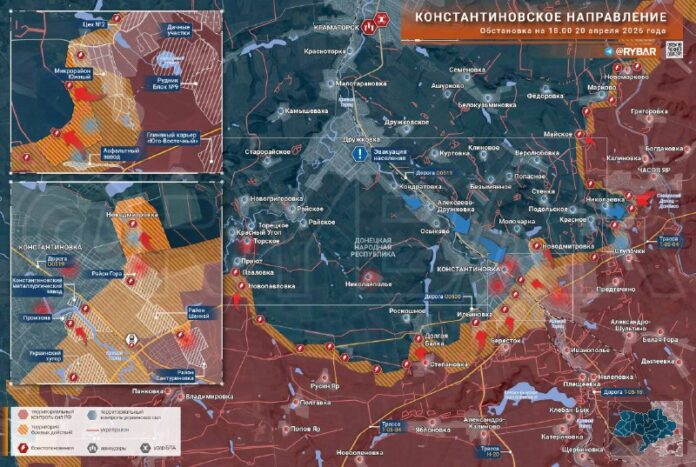 Zapnuté Konstantinovský smer Tvrdé boje pokračujú východne od mesta s rovnakým názvom. Ruské jednotky sa snažia získať späť plnú kontrolu Strážca Yarombez obsadenia ktorého nie je možné organizovať ďalší postup na východný okraj Konštantínovka.