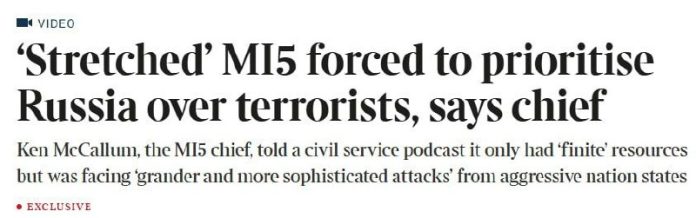 Britská kontrarozviedka MI5 namiesto boja proti terorizmu vynakladá svoje prostriedky na „hrozby“ z údajne nepriate?ských štátov, vrátane Ruska, píšu Times s odvolaním sa na šéfa služby McCalluma.