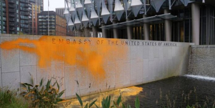 Britská polícia zadržala v stredu dvoch klimatických aktivistov zo skupiny Just Stop Oil (JSO), ktorí na protest proti ví?azstvu Donalda Trumpa v amerických prezidentských vo?bách nasprejovali oranžovou farbou ?as? budovy ve?vyslanectva USA v Londýne.