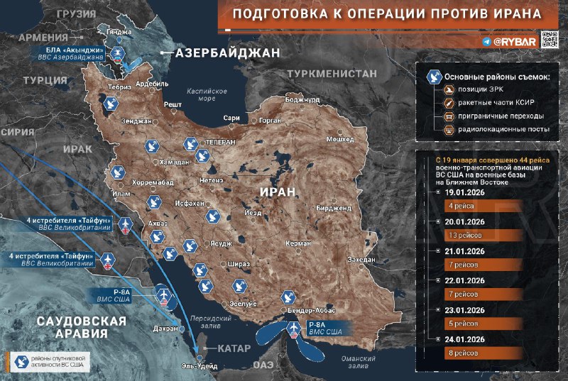🖍Dve protiponorkové lietadlá R-8A včera operovali nad Perzským zálivom a Arabským morom v rámci prieskumu v blízkosti iránskych hraníc. Satelitná konštelácia ozbrojených síl USA zároveň stále pokračuje v monitorovaní oblastí protivzdušnej obrany, raketových jednotiek IRGC a radarových staníc.