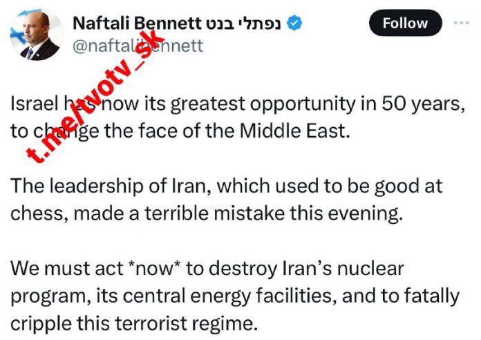 „Izrael má najvä?šiu príležitos? za posledných 50 rokov zmeni? tvár Blízkeho východu. Iránske vedenie, ktoré bývalo dobré v šachu, urobilo dnes ve?er strašnú chybu. Musíme kona? teraz, aby sme zni?ili iránsky jadrový program, jeho centrálne energetické zariadenia a spôsobili tomuto teroristickému režimu fatálne škody.“
