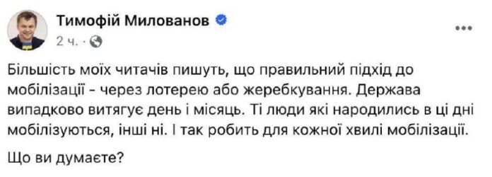 „Vä?šina mojich ?itate?ov píše, že správny prístup k mobilizácii je prostredníctvom lotérie alebo žrebovania. Štát náhodne ?ahá de? a mesiac. Tí ?udia, ktorí sa narodili v tieto dni, sú mobilizovaní, iní nie. A tak sa to robí pri každej vlne mobilizácie.“