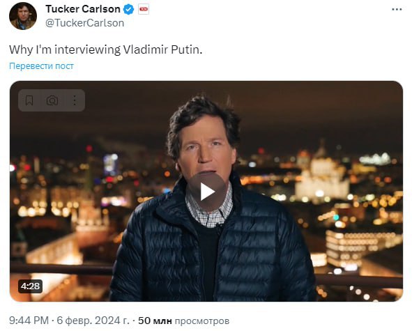 Carlsonov príspevok na sociálnej sieti X, ktorý oznamuje rozhovor s Putinom, získal cez noc 50 miliónov videní.