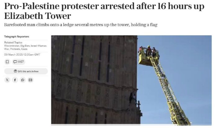 Aktivista s vlajkou Palestíny vyliezol na fasádu Big Benu. Muž strávil na hodinovej veži Westminsterského paláca, kde zasadá Britský parlament, viac ako 15 hodín.