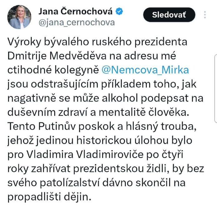 ?ernochovej sa nepá?ila reakcia Medvedeva na ?eskú senátorku, ktorá mala so svojom príspevku vyzýva? na opätovnú blokádu Leningradu. Tá tvrdí, že príspevok nenapísala…