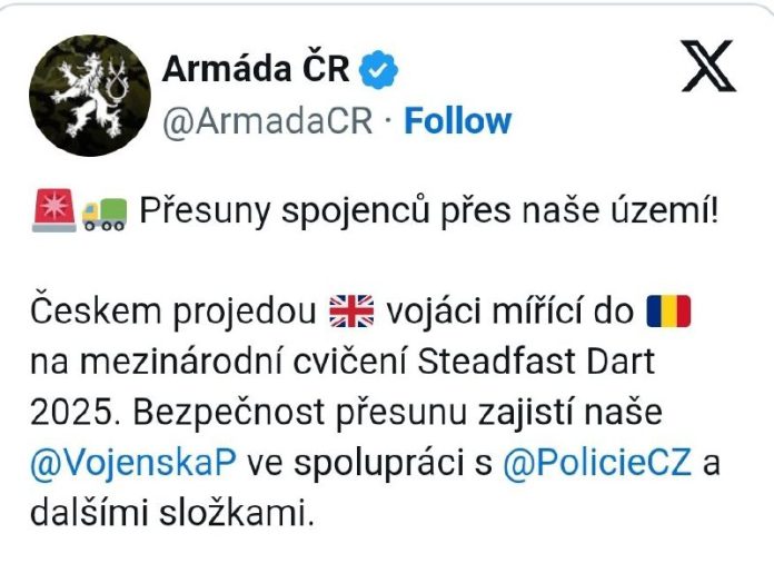 Konvoje prídu z Nemecka cez hrani?ný priechod Krásny Les a budú pokra?ova? po dia?nici D8, Pražskom okruhu, D1 a ceste I/38 do vojenského areálu Ran?í?ov na Jihlavsku. Odtia? sa potom presunú do B?eclavi, na hrani?ný priechod so Slovenskom, po ceste I/38 a dia?niciach D1 a D2. Z cvi?enia sa budú jednotky vraca? v marci.
