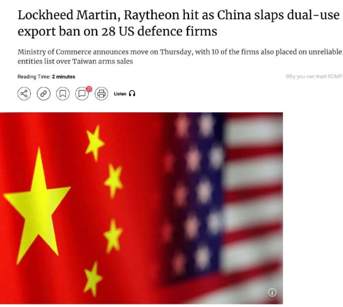 Okrem toho Ministerstvo obchodu ?ínskej ?udovej republiky vydalo ešte jedno vyhlásenie, pod?a ktorého boli na zoznamy nespo?ahlivých dodávate?ov v súvislosti s predajom zbraní vláde Taiwanu zaradené desiatky zahrani?ných obranných firiem.