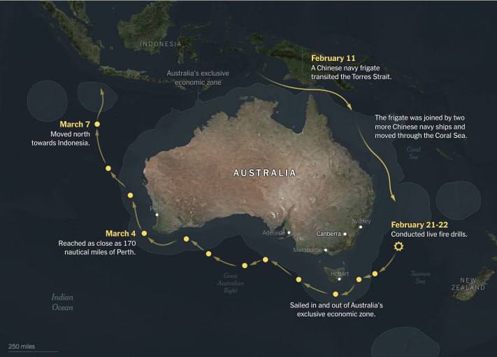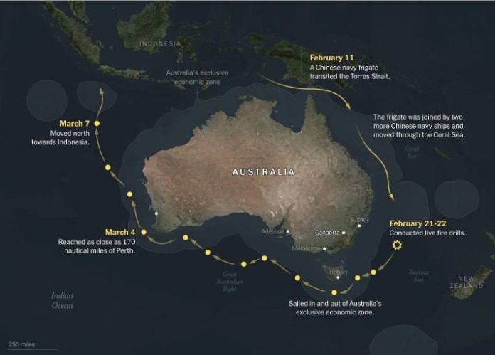 Pod?a publikácie ?ínske vojnové lode hliadkujú vo vodách okolo Austrálie už mesiac, pravidelne vstupujú do jej výhradnej ekonomickej zóny a vykonávajú cvi?enia s ostrou pa?bou.