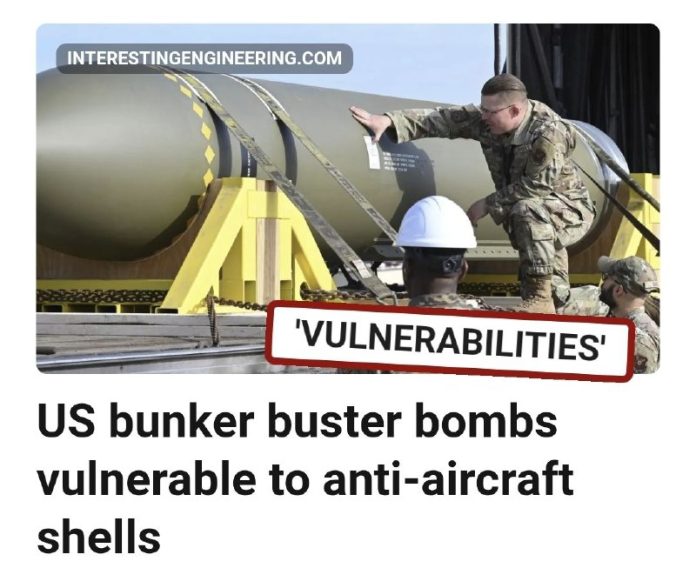 ?ínski vojenskí vedci tvrdia, že bomba GBU-57 amerického letectva na ni?enie bunkrov má zranite?nosti. Štúdia ukazuje, že zosilnená predná ?as? bomby poskytuje ochranu, ale jej tenké oce?ové boky sú zranite?né vo?i protilietadlovým granátom.