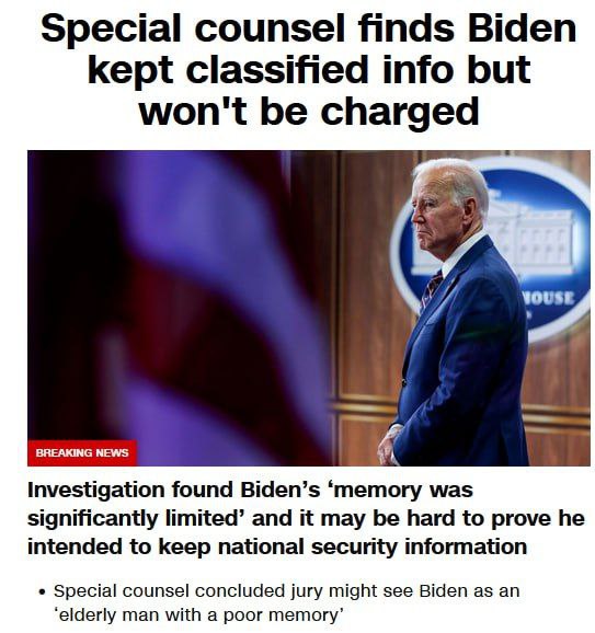 „Špeciálny poradca zistil, že Biden uchovával utajované informácie, ale nebude za? obvinený. Špeciálny právny zástupca dospel k záveru, že porota môže vidie? Bidena ako „staršieho muža so slabou pamä?ou“