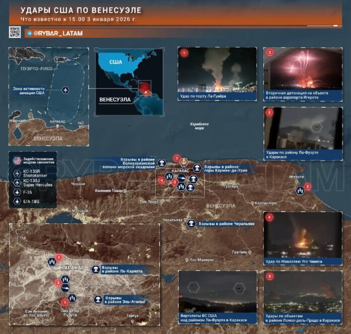 ▪️ Najmasívnejší útok prišiel na Caracas. Americké lietadlá vykonali sériu útokov na ciele v oblastiach La Fuerie A Lomos del Prado. Boli tam natočené aj doteraz jediné zábery potvrdzujúce prítomnosť amerických jednotiek na území Venezuely.