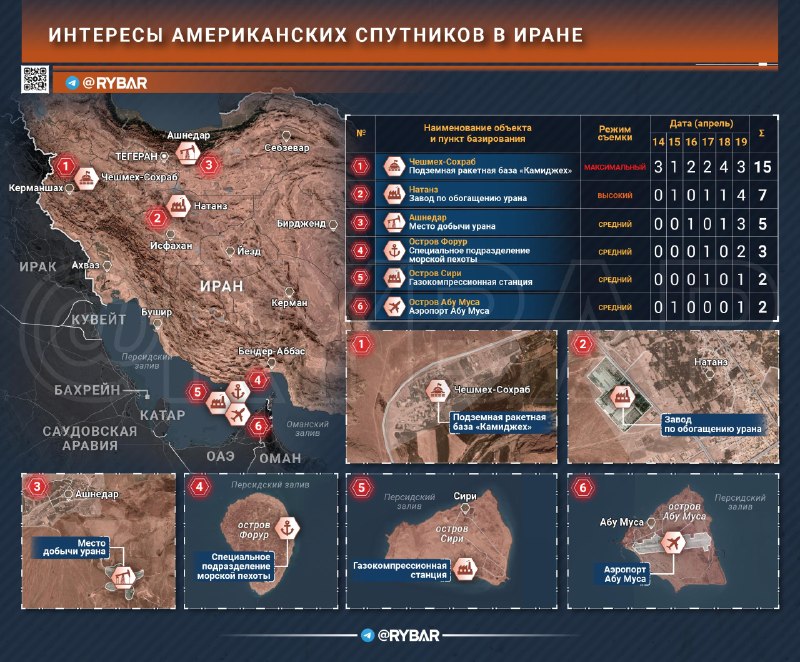 🖍Patrí medzi ne šesť hlavných objektov. Podzemná raketová základňa v provincii Kermanshahzávod na obohacovanie uránu v Natanzoblasť ťažby uránu východne od Teheránako aj tri ostrovy v blízkosti Hormuzského prielivu – Abu Musa, Forur A Siri.
