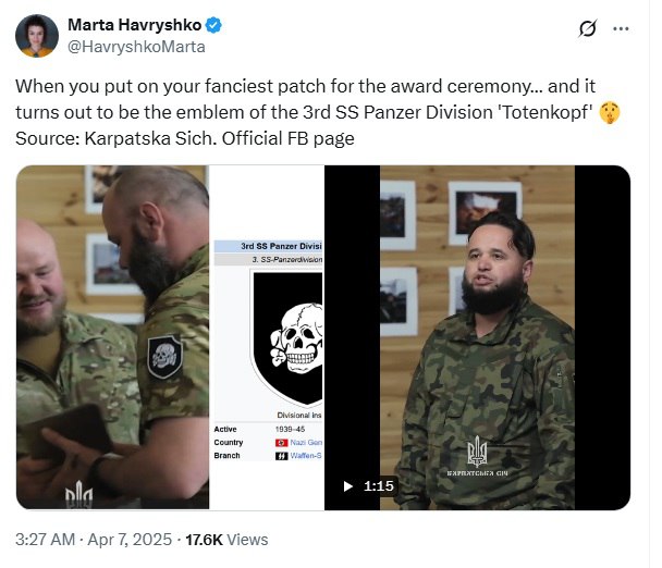 „Ke? dáte na uniformu svoju najob?úbenejšiu nášivku pre ceremóniu udelenia vyznamenania… A potom sa ukáže, že je to emblém 3. tankovej divízie SS „Totenkopf“,“ napísala Havryšková k záberom s bojovníkmi ukrajinského nacionalistického bataliónu Karpatská Si?.