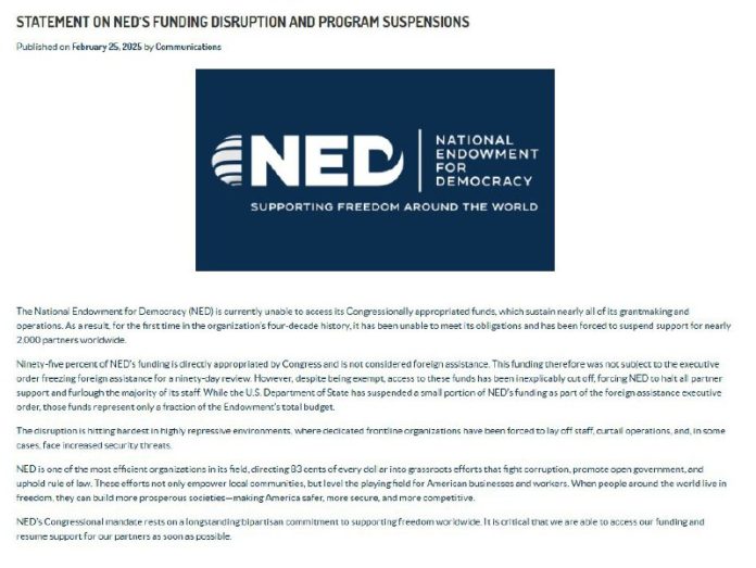 Národný fond pre demokraciu (NED) tvrdí, že nemá prístup k prostriedkom prideleným Kongresom, ktorými sponzoruje „takmer všetky“ svoje granty a operácie, a preto takmer 2 000 dodávate?ov po celom svete zostáva bez prostriedkov.