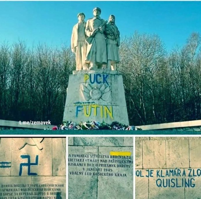 Urážlivé nápisy a hákový kríž nama?ované na pamätníku žltou a modrou farbou úplne prezrádzajú ideové korene sú?asných nasledovníkov tých, proti ktorým ?ervená armáda v roku 1945 bojovala za slobodu Európy.