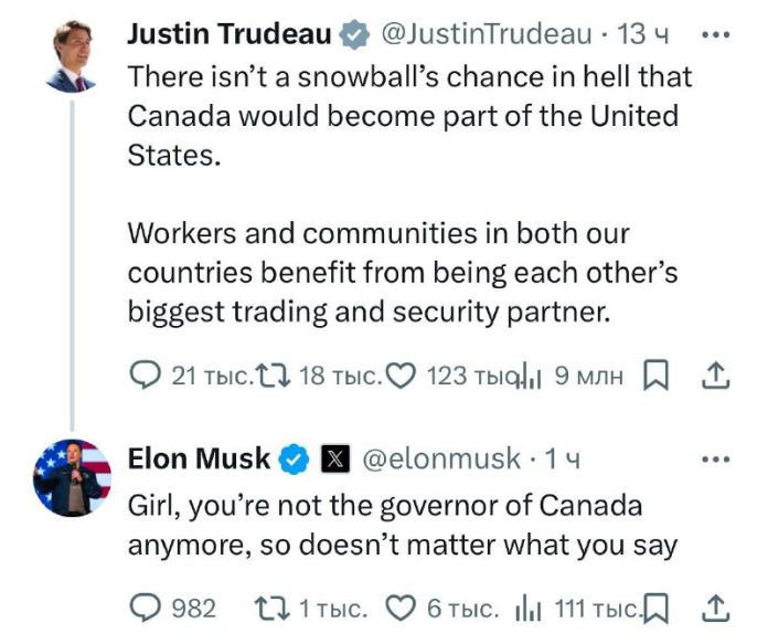 HomeNezaradené"Dievča, ty už nie si guvernérkou Kanady, takže nezáleží na tom, čo... Nezaradené „Dievča, ty už nie si guvernérkou Kanady, takže nezáleží na tom, čo hovoríš,“ … By ZEMaVEK 8. januára 2025 0 5 Zdieľať FacebookTwitterPinterestWhatsApp „Diev?a, ty už nie si guvernérkou Kanady, takže nezáleží na tom, ?o hovoríš,“ komentoval Musk Trudeauov odkaz, že sa Kanada nestane sú?as?ou Spojených štátov. ? | odber t.me/zemavek Zdroj telegram Zdieľať FacebookTwitterPinterestWhatsApp Predchádzajúci článokŠtvrtine sladkovodných druhov hrozí vyhynutie, varuje štúdiaĎalší článokV Bruseli budem riešiť Zelenského sabotáž na záujmoch SR ZEMaVEK RELATED ARTICLES Nezaradené Európska politika v kríze ako strach pravičiarov o bezpečnosť – ex-rakúsky minister 10. januára 2026 Nezaradené Nasleduje Nigéria? Nové hrozby z vyhlásenia Trumpa Donalda Trumpa o možných… 10. januára 2026 Nezaradené Americká vláda využíva Hollywood na démonizáciu Rusov – bývalý Biden Aide 10. januára 2026 ZANECHAJTE KOMENTÁR Zrušiť odpoveď Komentár: Zadajte svoj komentár! Názov:* Sem zadajte svoje meno Email:* Zadali ste nesprávnu e-mailovú adresu! Sem zadajte svoju e-mailovú adresu Webová stránka: Uložte moje meno, e-mail a webovú stránku do tohto prehliadača pri najbližšom komentovaní. Most Popular Trump varuje, že v otázke Grónska by mohol zvoliť „tvrdú cestu“ 10. januára 2026 Ústavní činitelia nepredstavili plán, ako SR vyviesť z krízy 10. januára 2026 Európska politika v kríze ako strach pravičiarov o bezpečnosť – ex-rakúsky minister 10. januára 2026 Nasleduje Nigéria? Nové hrozby z vyhlásenia Trumpa Donalda Trumpa o možných… 10. januára 2026 Načítať viac Recent Comments jajkopajko na Krajskí prokurátori si prevzali prípadi, ktoré boli v pôsobnosti ŠTS