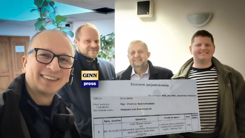 Dnes na súde – Hrabin vs Ministerstvo spravodlivosti – ešte starý roky tiahnuci sa súd za odškodné za neoprávnené disciplinárne konanie (bude aj video), ktoré na neho podala ešte transparentná pani Žit?anšká (na fotke z?ava Martin Martin Dano, Martin Pohovej – advokát splnomocnený JUDr. Michalom Mandzákom, Štefan Harabin – žalobca, a náš dlhodobý spolupracovník Juraj Vrablanský)
